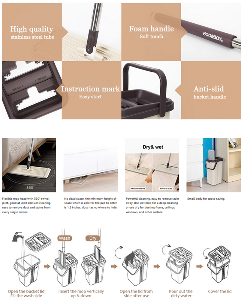 •  High quality: Super microfiber mop pad, stainless-steel pole, PP bucket, premium foam handle